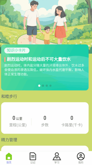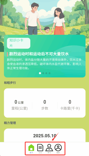 2、进入首页,这里有很多知识小卡片,还能记录运动步数及里程等信息。