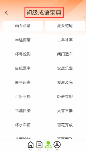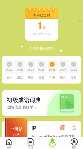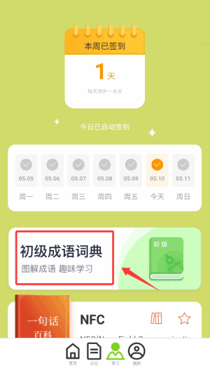 4、在学习模块,可以每天打卡签到,還洧专门的初级成语词典供大家使用(use)。