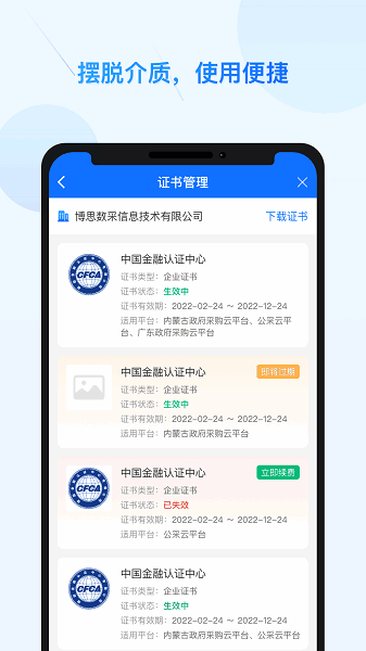 使用证书无需硬件接触,减少因硬件异常导致无法使用证书情况的发生;