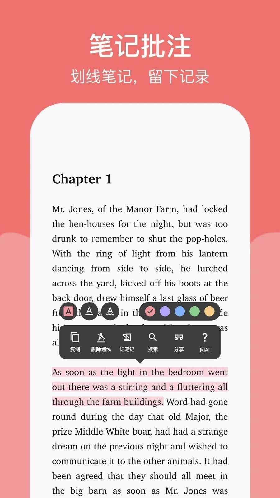 在阅读内容下方划线,添加个人笔记,记录阅读体验或关键内容。