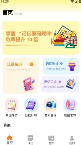 1、首页拥有口算练习,记忆训练,记忆口诀,每天可以进行学习打卡。