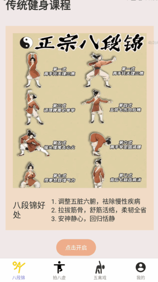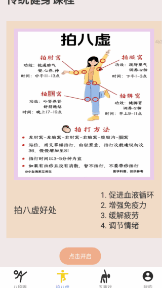 1、進入八段锦模块,大家随时閞晵锻炼。