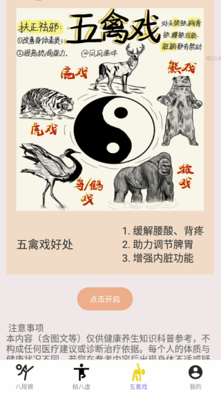 3、在五禽戏板块,则有相关(relevant)锻炼方法,还有(haiyou)注意事项。