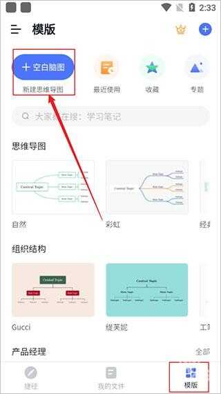 1、打开Processon软件,在【模板】区域选择【空白脑图/新建思维导图】。
