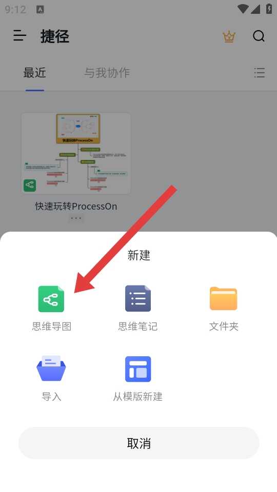 2、在新建选项菜单中,点击思维导图,进入思维导图编辑界面。
