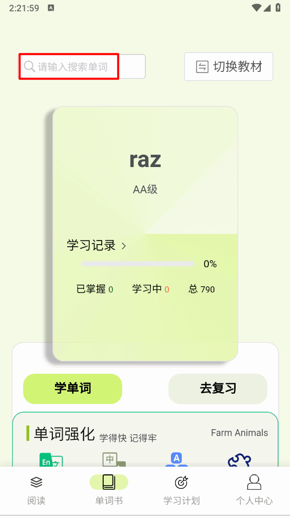 4、在“单词书”区域(area)可通过搜索功能查找并学习对应单词内容。