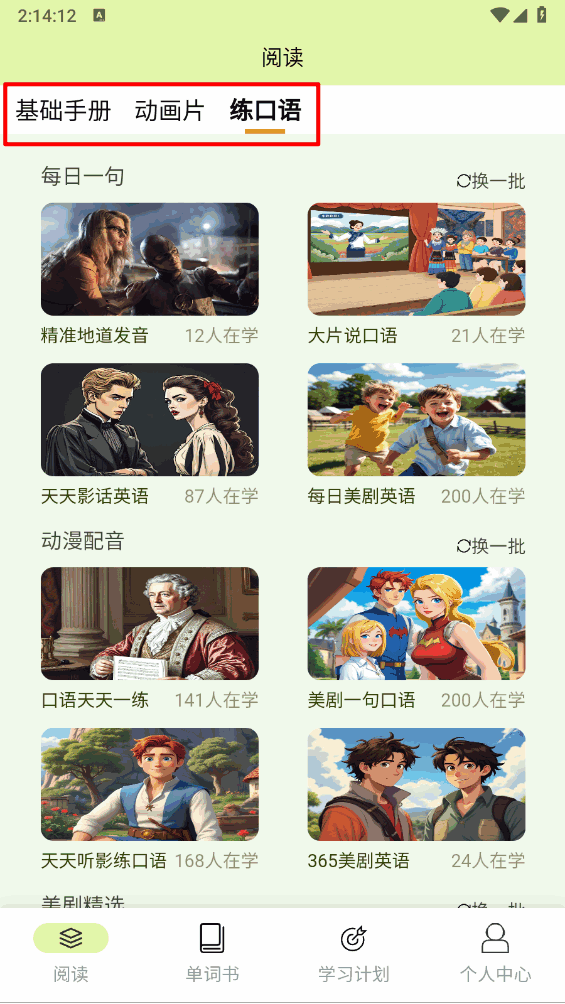2、首页界面展示了基礎手册、动画视频与口语练习模块,用户可根据学习目标(biao)自由点击。