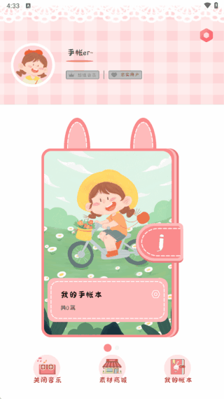 3、进入软件首页,用户可以直接開啟手账记录,也可以查看素材商城等功能。