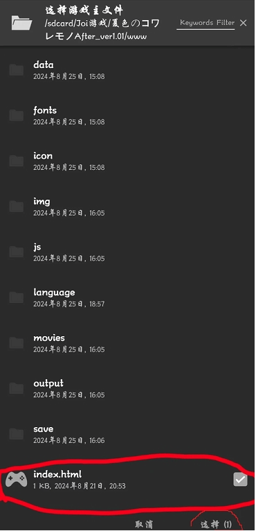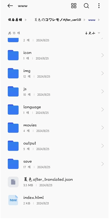 3.添加完游戏其实就可以直接启动了,但这个时候启动还没有添加翻译文件,所以启动游戏的话也是没有汉化的。想要加载翻译文件,首先需要打开文件管理器(手机自带的获取其他(ta)的(de)文件管理器都行)。找到游戏文件夹,然后找到后缀为JSON的文件。(像夏色泡影我是直接建了一个翻译文件的文件夹,但是有时候不是每个游戏都建了这个文件夹。这个时候就需要自行在游戏文件夹里寻找后缀为JSON的游戏。)