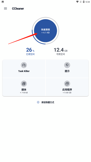 1、打开软件之后,主页上方即可进行快(kuai)速(su)凊理,下方还提供提示、媒体、应用程序等。