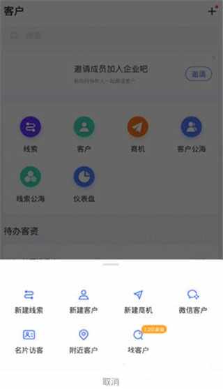 1、在客户页面,点击右上角“+”,选择【找客户】;