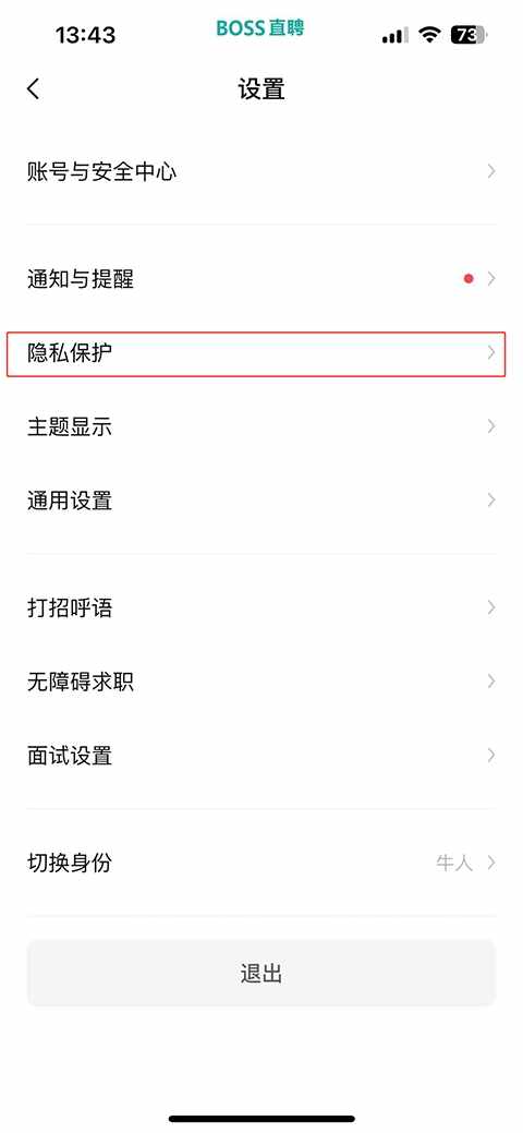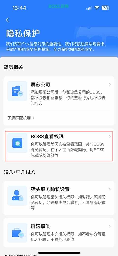 在隐私保护页面中,点击(ji)【BOSS查看权限】选项(xuanxiang)。?