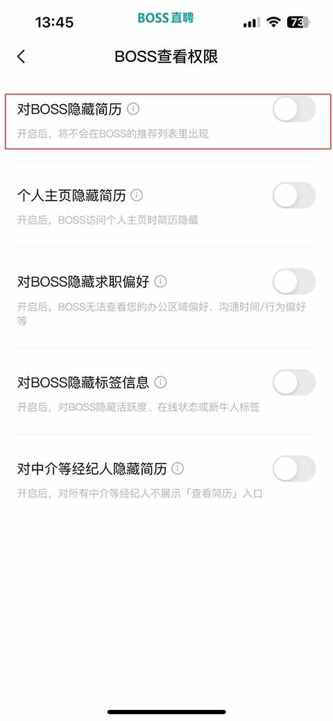 在BOSS查看权限页面中,找到【个人主页隐藏简历】或【对BOSS隐藏简历】的开关,将其打开(Open)即可完成隐藏简历的操作。??