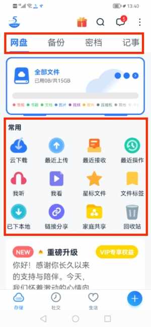 2、首页可在网盘、备份等板块间切换,便于管理个人文件(wenjian)数据。