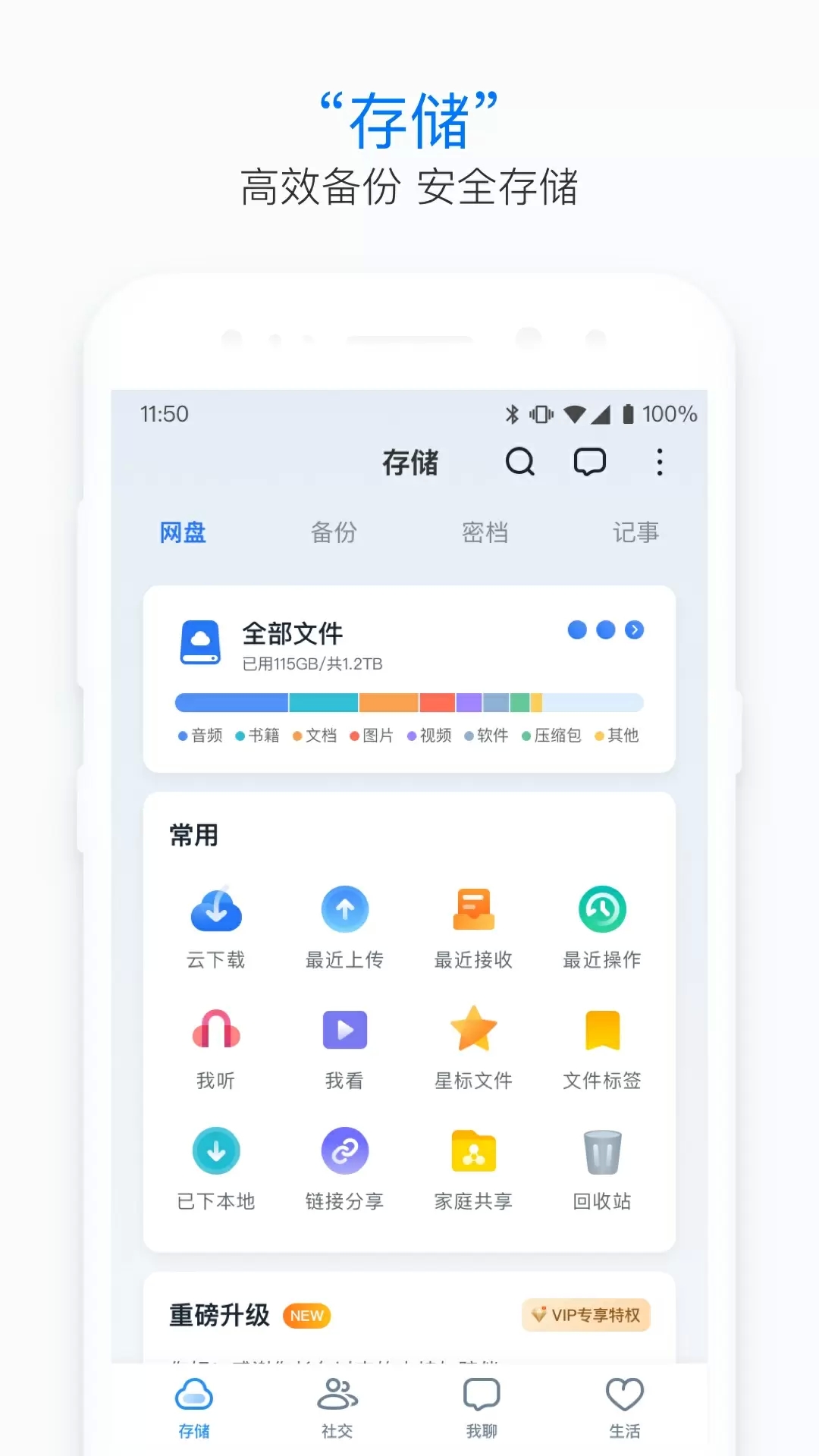 115——提供安全稳定、高效智能的云存储服务,支持相册、通讯录一键备份,海量空间(kongjian)轻松存储一生数据,并可直接在手机端远程管理各终端的设备登录情况,安心又省心