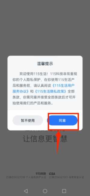 1、启动115生活应用,先在温馨提示页面点击同意接受相关协议。