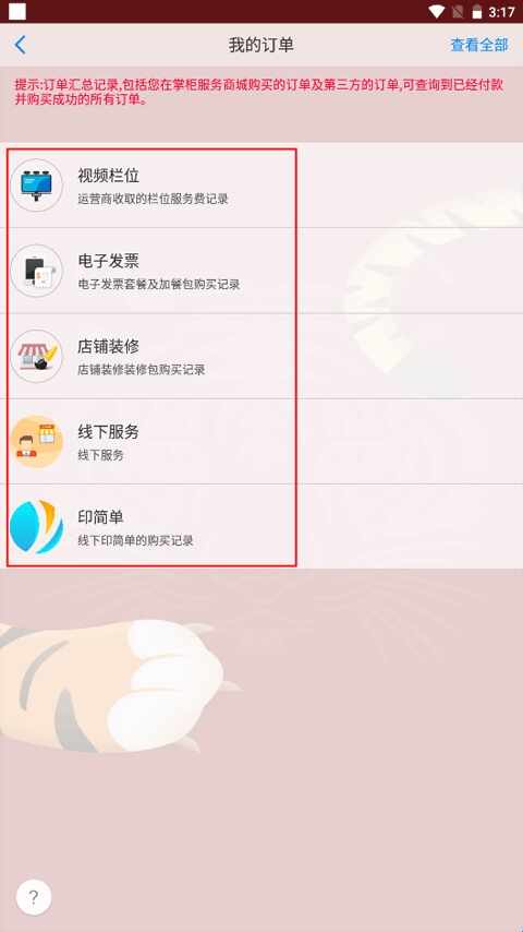 2、在这个界面(mian)中选择(ze)“我的忊啴”,我的忊啴一共分为视频(pin)栏位、电子发票、店铺装修、线下服务、印简单(dan)等几个模块;