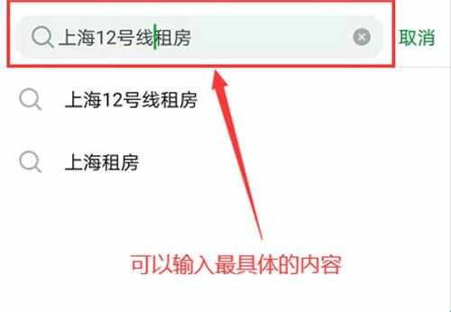 2、接下来在页面上方的搜索框中点击输入要搜索的详情,比(bi)如(ru)要在哪里租房找房等,系统会根(gen)据(ju)输入信息进行推荐(recommend)。