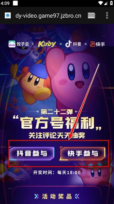 4.点击抖音参与和快手参与,关注(guanzhu)官方号然后评论就可以天天抽奖。