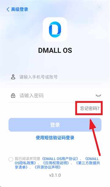 下载安装并打开dmallosapp,进入登录界面后点击忘记密码