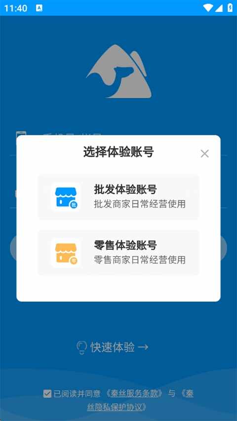 1、打开秦丝进销存APP,输入手机号进行注册,也可以先点击下方的快速体验。