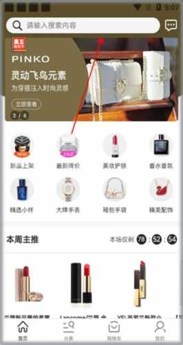 1、下载app,打开软件进入首界面,这里用户可以如下图箭头所指位(wei)置(zhi)搜索自己想要的商品;