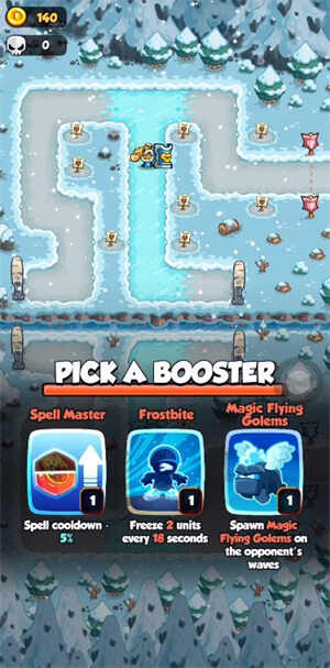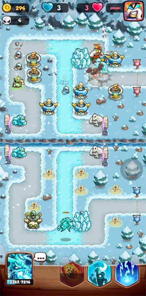 激斗王国保卫战最新版是经典塔防IP的PvP革新之作,将单人策略布局升级为与全球玩家的实时镜像对决。游戏摒弃了传统塔防的“单机刷关”模式,采用双屏同步战场设计——你与对手在相同地图上同时建造防御塔、部署英雄,既要抵御己方波次的敌人,又要通过法术干扰对方防线,三颗心生命值耗尽即告负,策略与心理博弈并存。