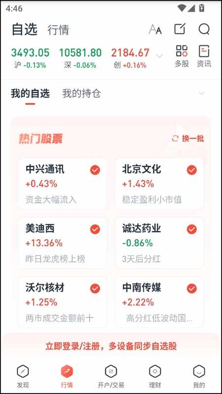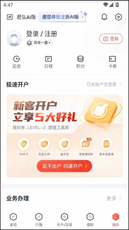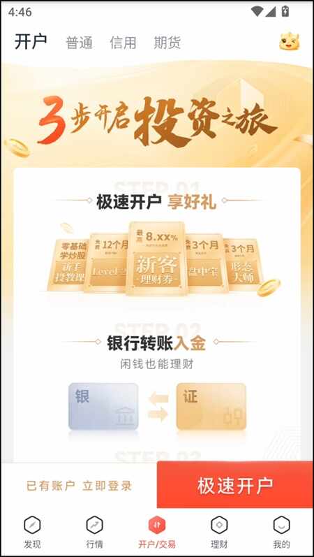 3、在开户/交易界面下,我们阔以进行极速开户,阔以更快、更好的投入股海。