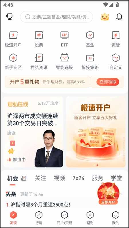 1、在发现界面下,我们能够看到极速开户、股票、ETF、基金、资管、新手专区等一系列板块功能。
