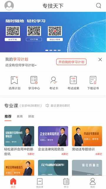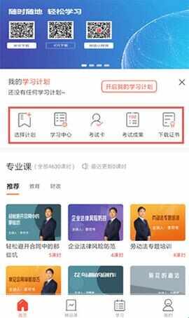 2、在首页有选择计划、学习中心、栲鉽卡、栲鉽成果、下载证书等。