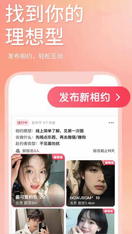 安全见面与活动管理功能:支持“行程共享”功能,用(yong)户(hu)线下见面时可与信任好友同步约会时间、地点,保障人身安全;“约友计划”功能可发起或报名线下活动,系统会展示活动详情,并提供活动沟通群,方便(fangbian)参与者提前熟悉,降低线下见面的尴尬感。
