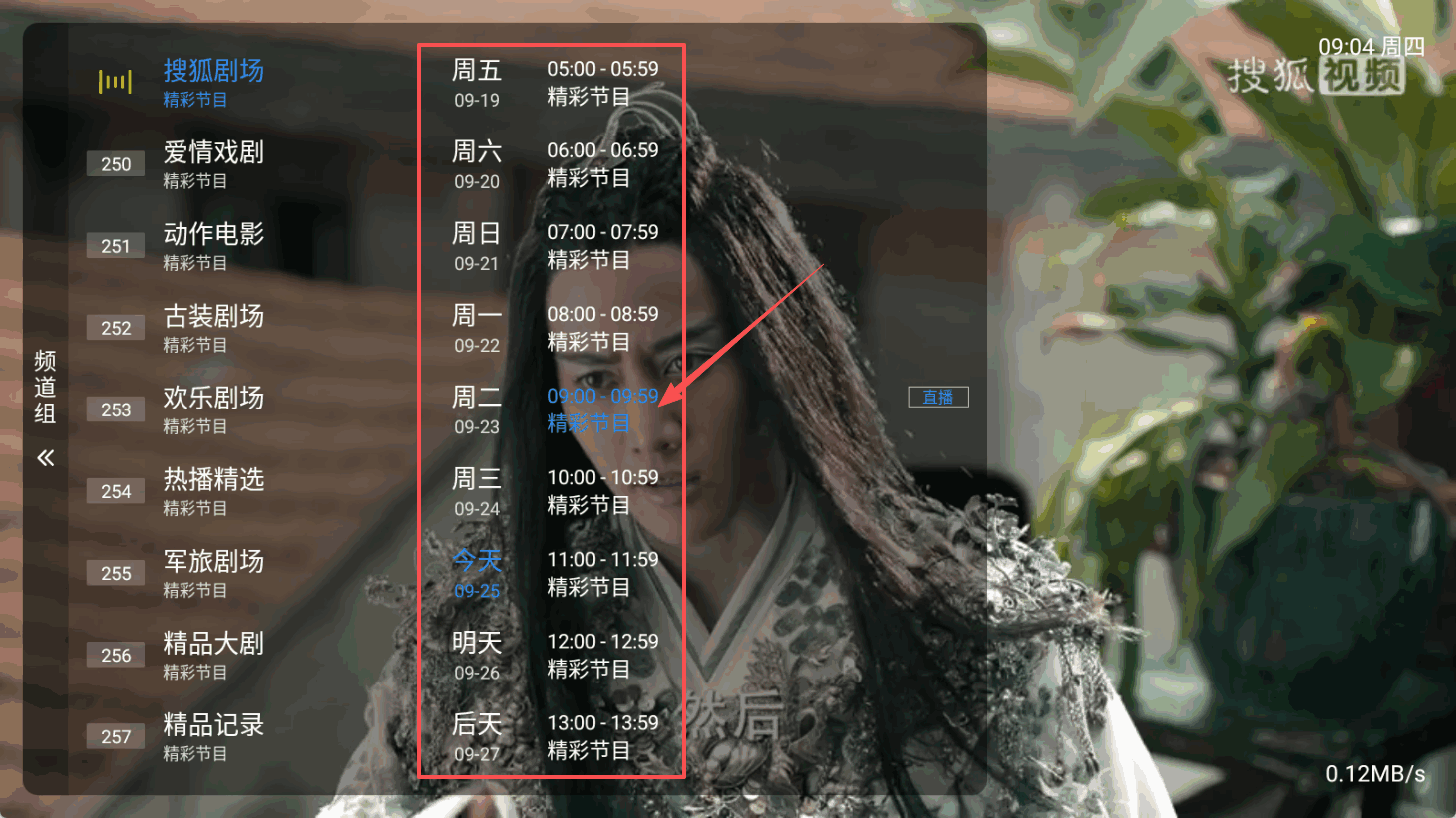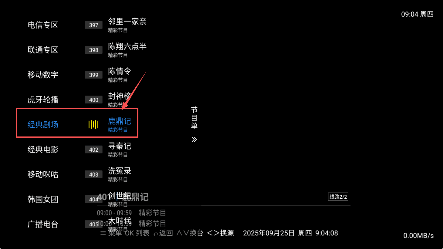 3、在电视节目菜单里,用方向键选经典剧场,按节目单查看更多剧目。
