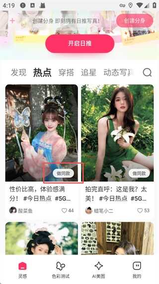 1、打(da)开(kai)妙鸭相机App,在灵感板块选择你喜欢的模版,点击做同款