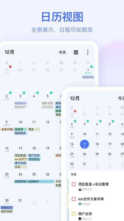 日历视图:在直观的日历视图中查看日程计划,轻松拖动任务即可实现管理。支持订阅第三方日历。