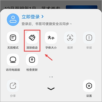 1、打开浏览器后,点击底部的“菜单”滑到第二页点击“清除痕迹”