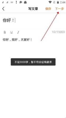 2、进入写文章页面中,将文章的标题以及正文全部输入,正文字数不能少于3000字,写完之后右上方“下一步”。