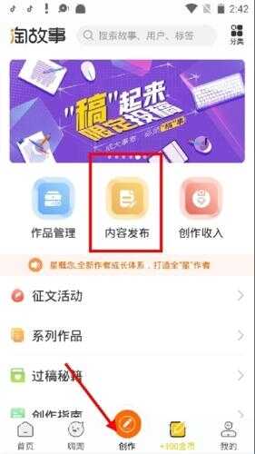 1、进入淘故事后,首先点击下方的“创作”,再点击页面中间的“内容发布”。