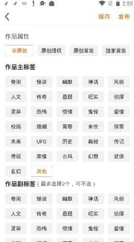 3、文章写好之后,还要选择作品的属性,根据作品的类型选择主标签、副标签,再根据作品内容填写20~50字的描述,其他内容可以自由选填,填写完毕后,点击右上方的“发布”。