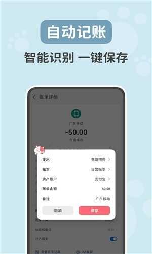 3、自动记账:与微信、支付宝等软件联动,收付款后自动弹出,实现一键快速记账。
