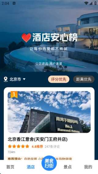 2、在酒店頁媔中可以了解当地评分最佳的也可以了解距(ju)离(li)最近的酒店;