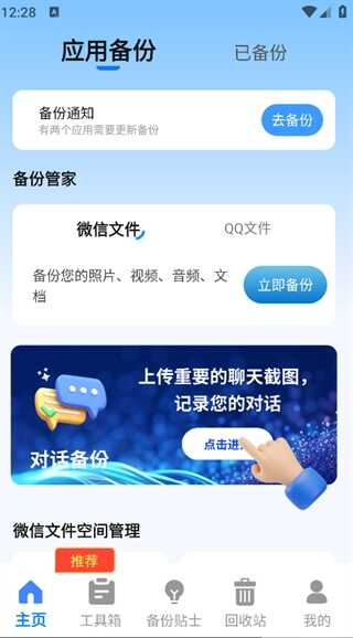 2、进入首页,可以看到备份通知、备份管家、微信文件空间管理等功能。
