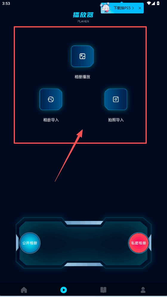 2、进播放器点相册导入按钮,能选公开或私密相册,导入就能播放。