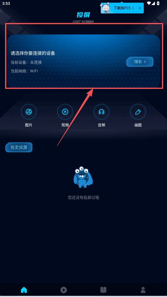 1、点投屏界面(mian)右上角搜索按钮,搜要连的设备,搜到点它就连上了。