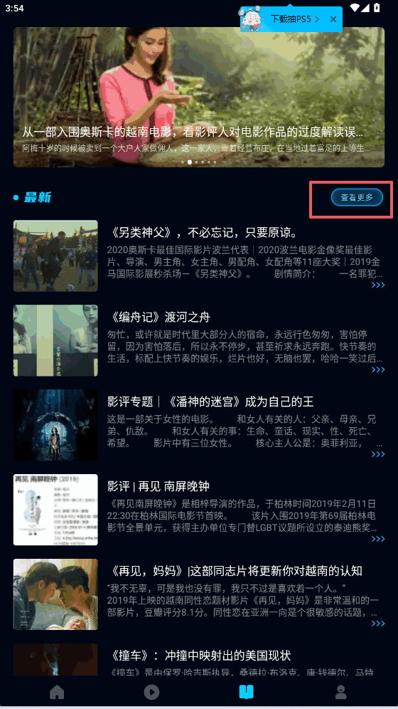 3、在最新栏目点查看更多按钮,能看到更多電影推荐,点影片直接看。