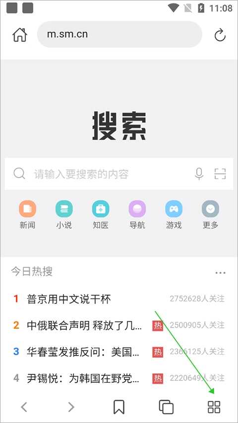 2、进入应用页面后,点击底部扩展图标(下图绿色箭头所指)
