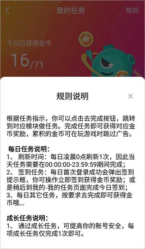 下载进入软件后,先来看看游戏金币的规则,根据任务指示,你可以点击去完成按钮,跳转到对应模块做任务。完成任务即可获得对应金币奖励,累积的金币可在玩游戏时跳过广告。