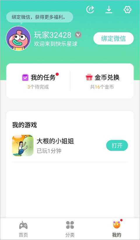 对于新手朋友来说可以进行微信的绑定,绑定之后也可获得金币,大家可以根据自己的需求选择。