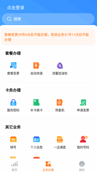 4、在业务办理模块,则能进行套餐变更、重置、补卡换卡等。
