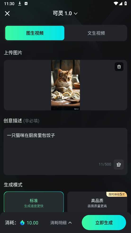 4、回到首页点击AI视频,上传刚刚保存的图片,输入(enter)提示词,完成后点击立即生成,可以选择5秒或(huo)者(zhe)10秒的视频。上方选择可灵1.0可以节省生成时(shi)间。