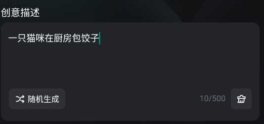 1、在AI图片创意描述里输入(enter)提示词,比如:一只猫咪在厨房里包饺子。